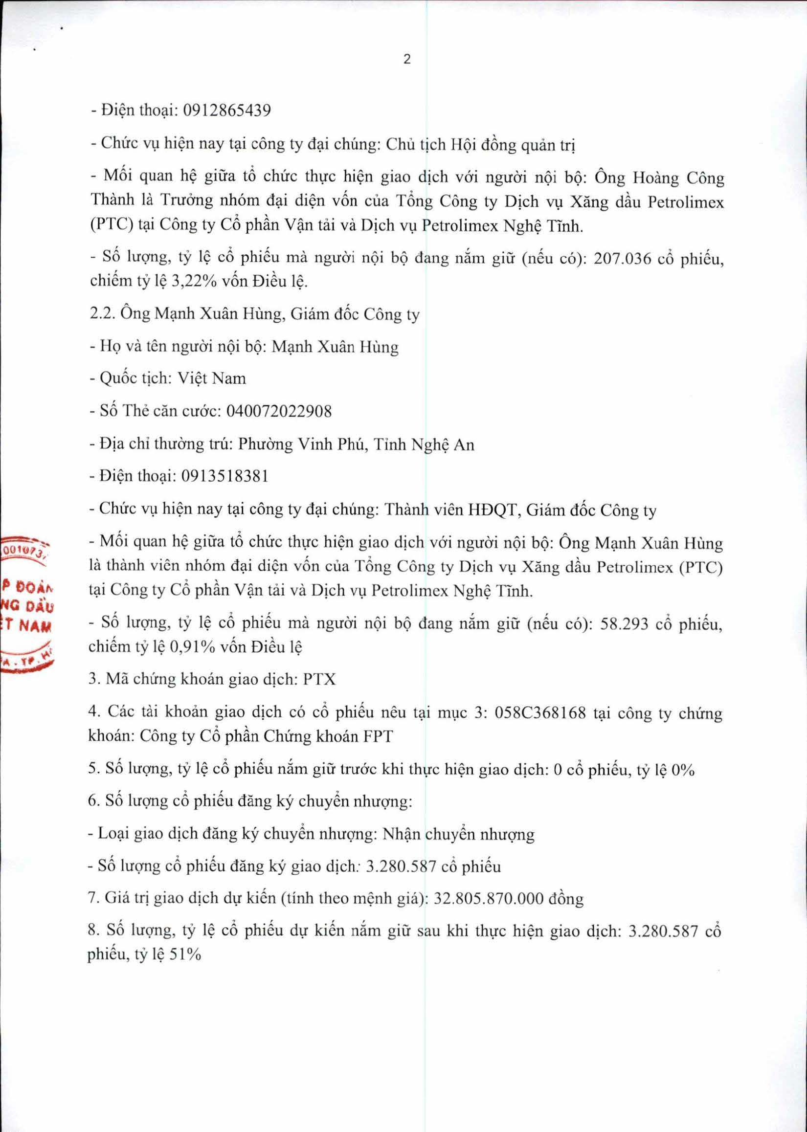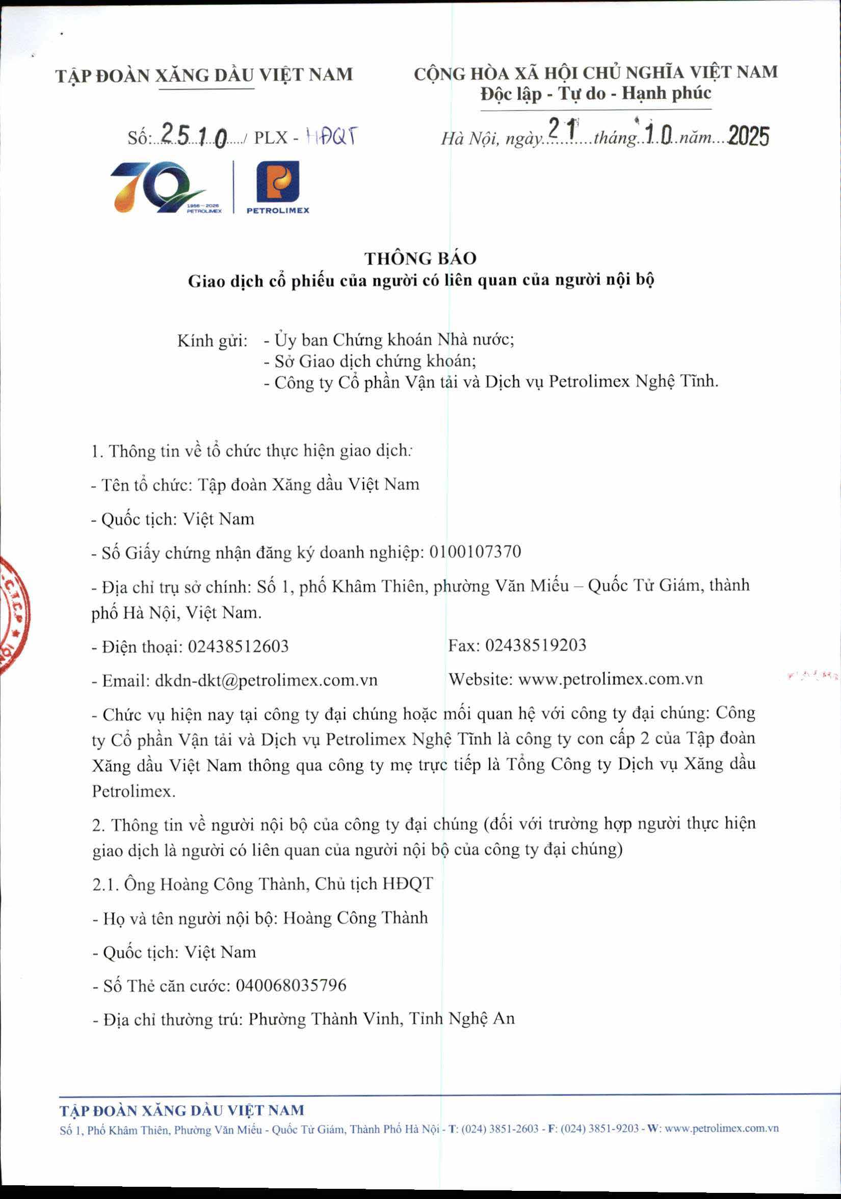 Thông báo giao dịch cổ phiếu của người có liên quan của nội bộ tại Công ty cổ phần Vận tải và Dịch vụ Petrolimex Nghệ Tĩnh